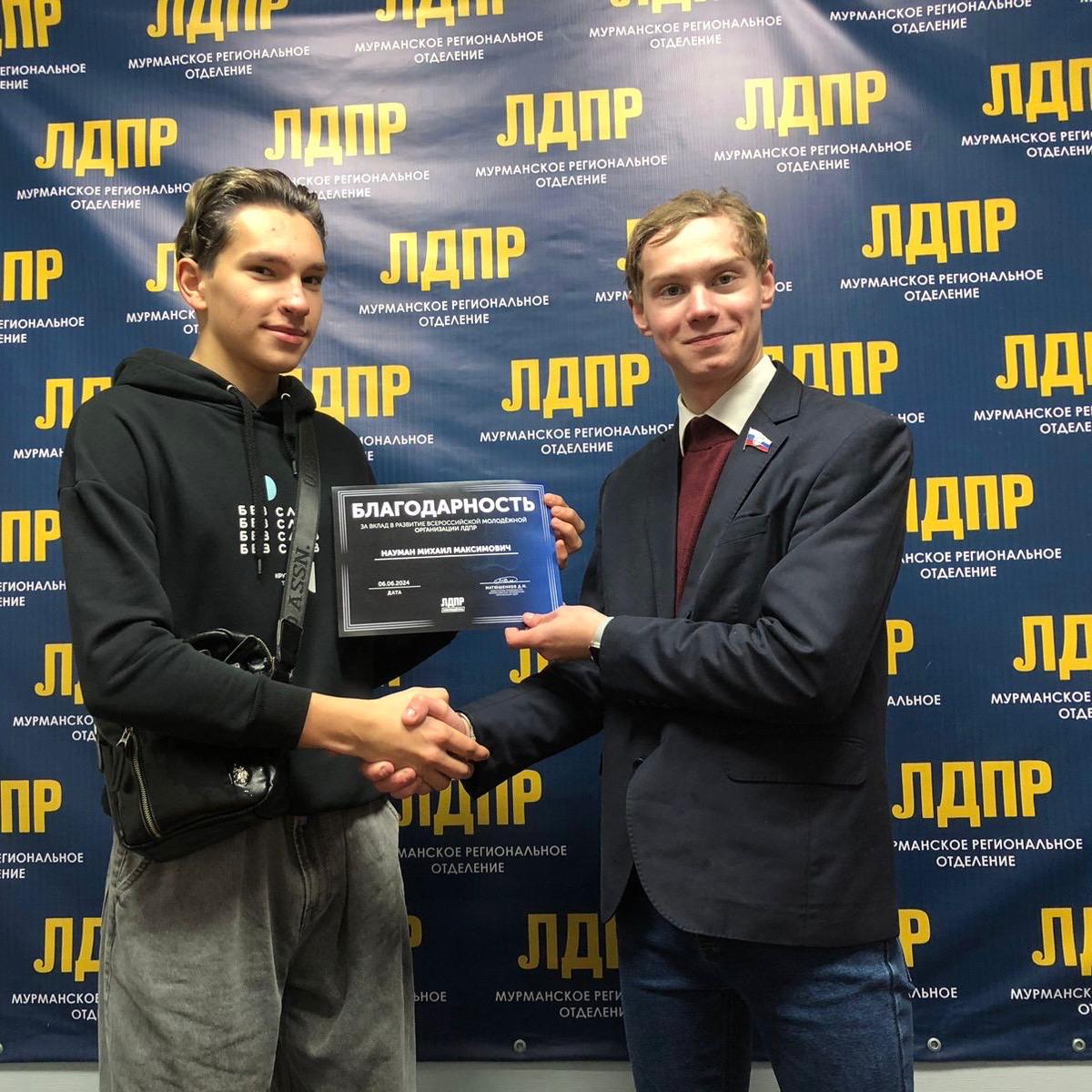 В Мурманском региональном отделении ЛДПР прошло награждение активиста молодежной организации Михаила Наумана за его значительный вклад в развитие Всероссийской молодежной организации ЛДПР