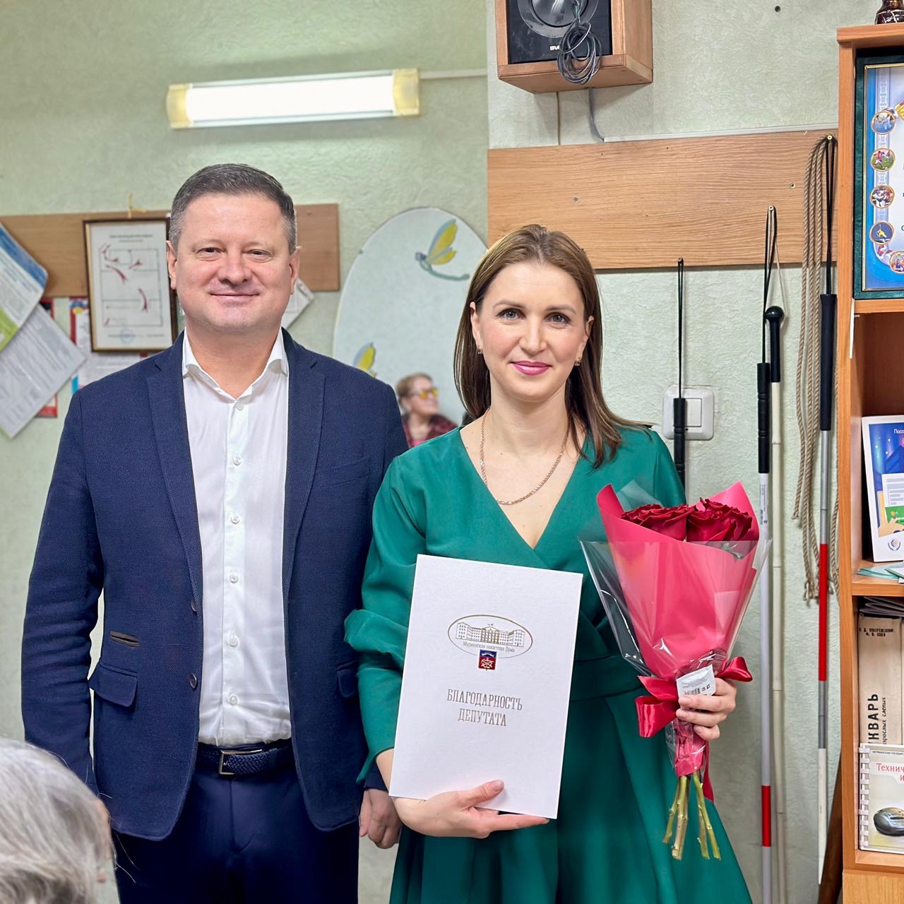 В торжественной обстановке представитель ЛДПР вручил Благодарность депутата Ватанской Евгении Геннадьевне, председателю обособленного подразделения РО ВОС. В своей речи он поблагодарил её за активную гражданскую позицию, важный труд, душевное тепло и милосердие, которые она проявляет в своей работе.