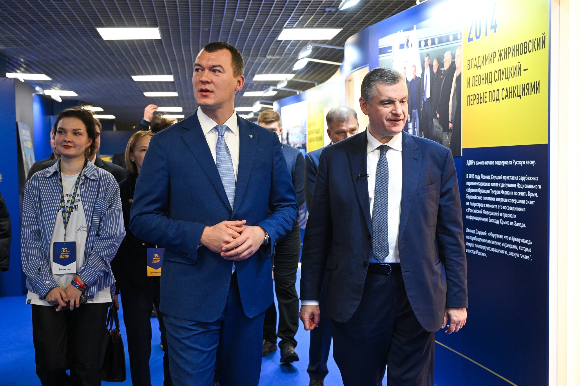 11 декабря Леонид Слуцкий, лидер ЛДПР, провел экскурсию по выставке «ЛДПР: 35 лет с народом» для министра спорта Михаила Дегтярева. В ходе визита они осмотрели экспозицию и интерактивные площадки, включая зону волонтерского центра поддержки специальной военной операции (СВО), где осуществляется сбор гуманитарной помощи, а также представительства Университета мировых цивилизаций имени Владимира Жириновского и Молодежной организации ЛДПР